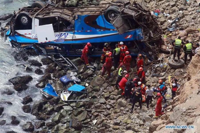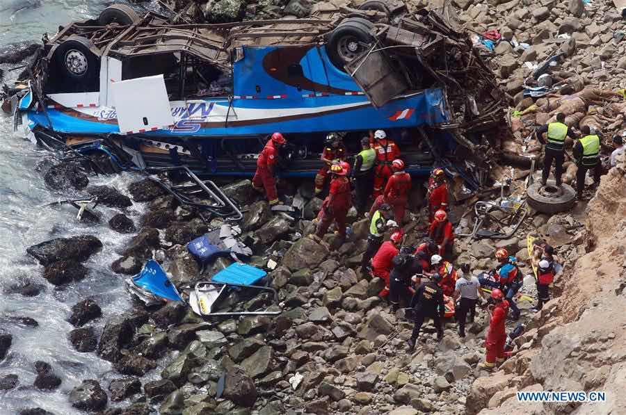 « La chute d’un autocar a fait au moins 48 victimes », annonce un communiqué publié sur le site internet du ministère péruvien de l’Intérieur, précisant que la récupération des corps a été suspendue à la tombée de la nuit en raisons des fortes vagues dues à la marée.