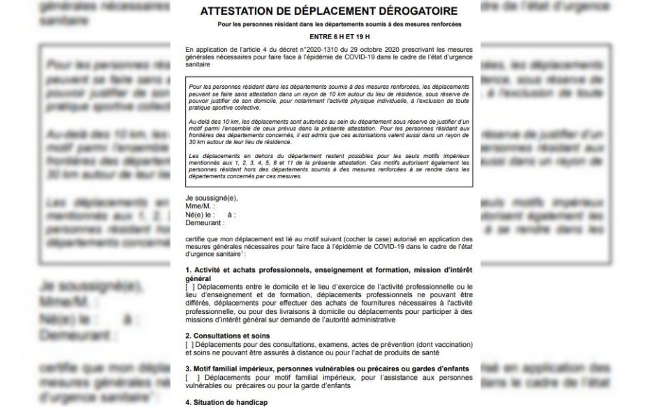 Celle pour les habitants à nouveau confinés est valable dans les 16 départements concernés. Il s’agit d’une attestation de journée, entre 6 h et 19 h pour les déplacements de plus de 10 kilomètres.