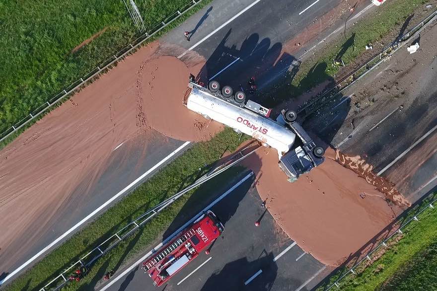 Une autoroute se transforme en fleuve de chocolat chaud en Pologne.
