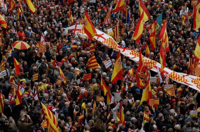 Dans une marée de drapeaux espagnols et de bannières aux couleurs de la région fictive, les manifestants ont défilé dans le centre de Barcelone jusqu’au siège du gouvernement de la Catalogne, où les indépendantistes ont la majorité absolue en sièges au Parlement.