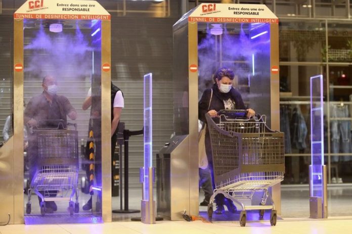 Ressemblant à des portiques de détection de métaux, mais diffusant des ultrasons, des ultraviolets et une solution, deux tunnels de désinfection, visant à « casser la propagation » du Covid-19 ont été installés lundi à l’entrée d’un hypermarché de la périphérie d’Ajaccio.