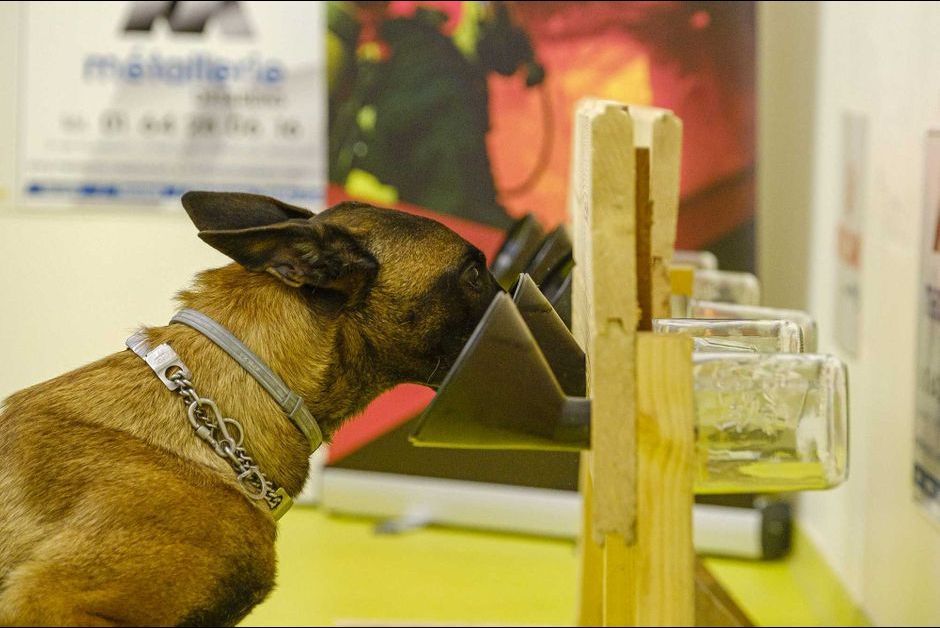 L’un des chiens aboie. « Elle a marqué. Elle a aboyé, pour montrer au maître qu’il y a un marquage », explique Brice Leva, chef d’unité chez ces pompiers dresseurs de chiens. Le marquage d’une odeur signifie celle que dégage le malade du virus. Dans cette salle dédiée, Maïka, berger malinois, la détecte en plaçant sa truffe dans un entonnoir. À l’intérieur est installé une compresse que la personne dépistée a placé sous son aisselle. « Il y a une odeur commune à la maladie », poursuit Brice Leva. Une odeur caractéristique présente dans la sueur humaine, non contaminante. « Le chien, c’est 220 millions de cellules olfactives », contre 5 millions pour l’homme.