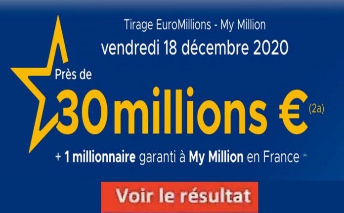L’intégralité des résultats de l’Euromillions est désormais en ligne ci-dessous. Ce vendredi 18 décembre 2020, 30 millions d’euros étaient mis en jeu pour le tirage de l’Euromillions. Verdict !