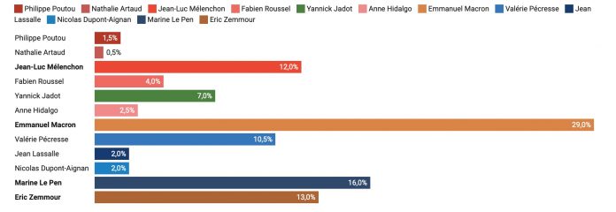 En troisième positions on retrouve Eric Zemmour (13%) qui précède Jean-Luc Mélenchon (12%).