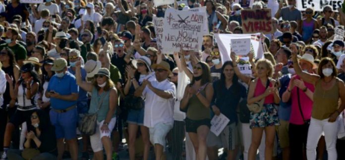 La foule, mobilisée par les réseaux sociaux, s’est rassemblée sous le drapeau espagnol géant qui décore la place Colon, dans le centre de la capitale. Pilar Martin, une femme au foyer de 58 ans originaire de Saragosse a déclaré être venue manifester parce qu’elle pensait que les gouvernements du monde entier exagèrent les chiffres des personnes infectées afin de restreindre les libertés publiques. « Ils nous forcent à porter les masques, ils veulent nous confiner. Ce ne sont que des mensonges », a-t-elle déclaré.