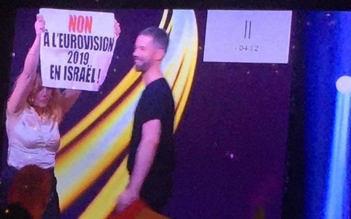🔴 En direct sur @France2tv, des militant·e·s BDS perturbent l’émission #DestinationEurovision pour protester contre la tenue de l’Eurovision 2019 en Israël. Pas de service public au service de l’apartheid ! #DestinationApartheid #BoycottEurovision2019 pic.twitter.com/7rxISQKq83
