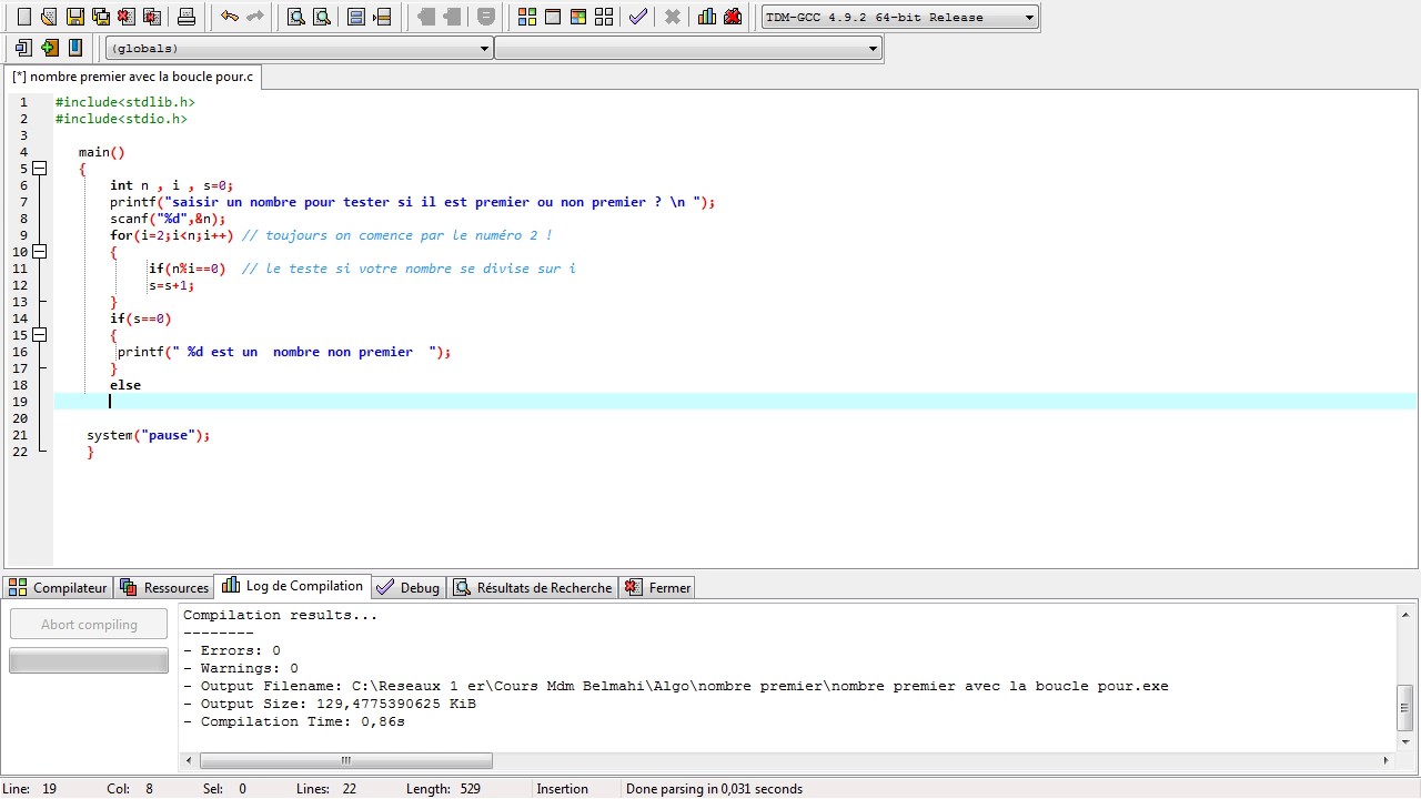 Dans ce programme, la fonction EstPremier prend un nombre en entrée et utilise une boucle for pour vérifier s’il a des diviseurs autres que 1 et lui-même. La boucle s’arrête lorsque le diviseur potentiel atteint la racine carrée du nombre, car si le nombre n’est pas premier, au moins un de ses diviseurs doit être inférieur ou égal à sa racine carrée.