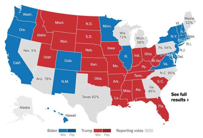 Les résultats de la Pennsylvanie (20 grands électeurs), du Michigan (16), de la Géorgie (16), de la Caroline du Nord (15) et du Wisconsin (10), où les deux candidats étaient au coude-à-coude avant l’élection, sont très attendus. Ces Etats pivots devraient faire basculer l’élection. Le Nevada (6) pourrait mettre plusieurs jours pour déclarer un vainqueur. En outre, un grand électeur du Maine doit encore être attribué.