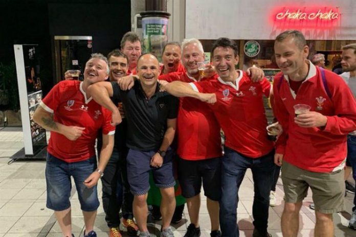 Sur le cliché, publié sur Twitter on voit Jaco Peyper, l’arbitre sud-africain hilare, au milieu de supporteurs gallois, en train de se moquer du coup de coude qui a valu un carton rouge à Sébastien Vahaamahina.