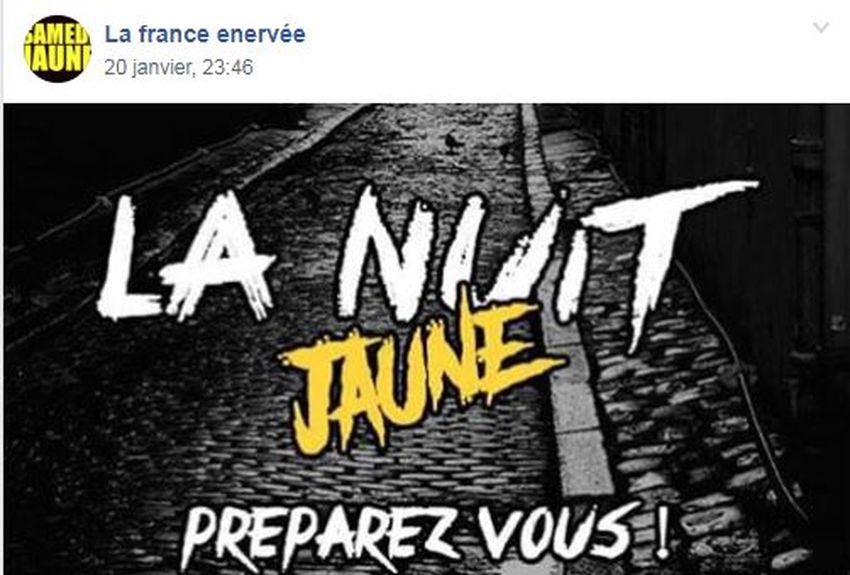 « Les semaines passent et les citoyens s’organisent face à votre surdité », constate Eric Drouet dans cette lettre ouverte partagée sur Facebook. La veille, il avait posté sur la même page un autre visuel avec ce message, sur fond de ruelle pavée : « La nuit jaune, préparez-vous ! ». Les « gilets jaunes », souffle Drouet, « peuvent se manifester à chaque instant et partout, le jour, la nuit, le week-end, la semaine… ».
