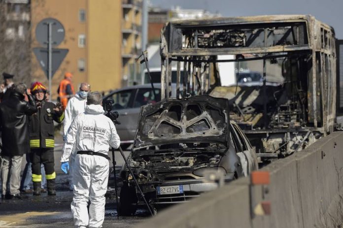 Au fond du bus, l’un des jeunes otages a pu défaire ses liens et téléphoner pour appeler au secours. Quand les carabiniers ont commencé à libérer les collégiens par une fenêtre cassée à l’arrière du bus, le chauffeur a mis le feu au véhicule.