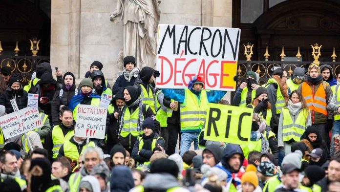 La photo, prise par un photographe de l’AFP et où l’on voit un gilet jaune brandir une pancarte « Macron Dégage », a été retouchée lors de sa diffusion télévisée au JT de 19H de France 3 samedi, et l’on y voit uniquement « Macron ».