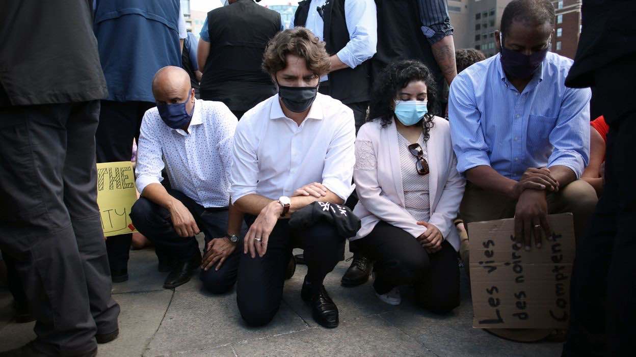Masque noir sur le visage, Justin Trudeau a plusieurs fois mis le genou à terre, la dernière pendant 8 minutes 46 secondes, le temps qu’a duré le supplice de George Floyd sous le genou du policier blanc Derek Chauvin, malgré ses supplications.