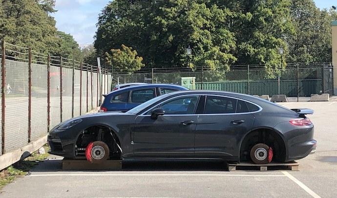 Une image choc d’une Porsche Panamera prise en photo sur le parking d’un centre Porsche de Stockholm en Suède, retrouvée sans ses roues et posée sur des palettes en bois.