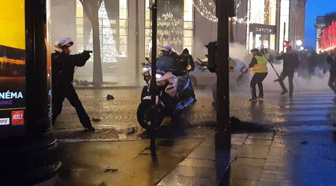 Samedi 22 décembre, vers 17 heures 30, une manifestation sauvage de «gilets jaunes» descend l’avenue des Champs-Elysées, après une journée de déambulation dans les rues parisiennes. À l’angle de l’avenue Georges-V, quatre policiers à moto forment une ligne et lancent, à tour de rôle, des grenades en direction de la foule. Plusieurs manifestants s’avancent alors vers eux. En quelques instants, le rapport de force semble s’inverser.
