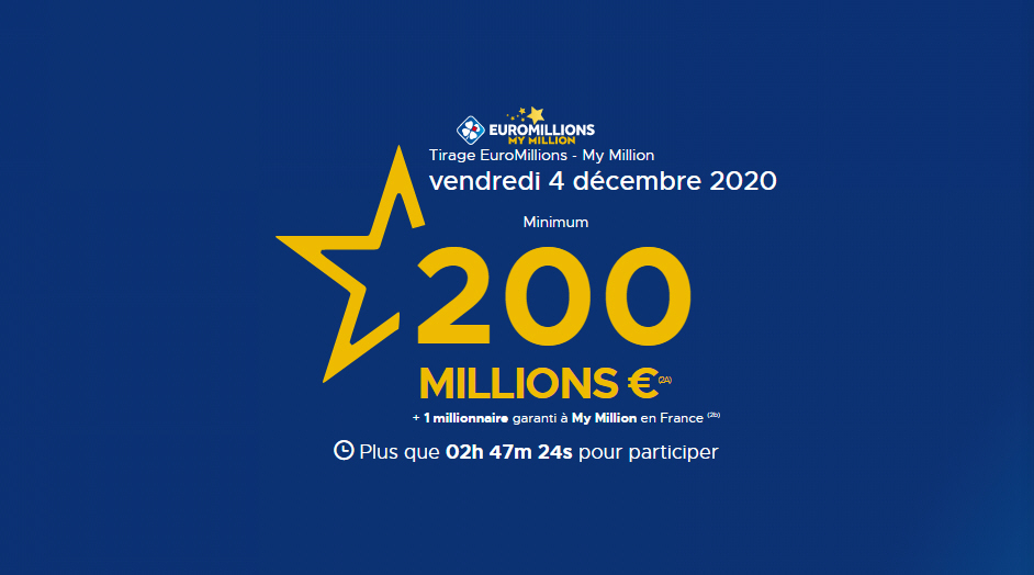 La cagnotte de l’Euromillions atteint une nouvelle fois des sommets : 200 millions d’euros au tirage de ce vendredi 4 décembre 2020 soir. Les numéros gagnants sont ceux qui seront tirés au hasard lors du tirage. Si vous trop dépensé en ce jour de Black Friday, 200 millions devraient vous remettre à flot.