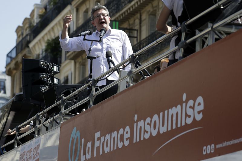 « Nous sommes tous là pour donner du courage aux cheminots, aux hospitaliers, aux travailleurs de tous les secteurs », a lancé le leader de la France insoumise Jean-Luc Mélenchon, dans une harangue à la foule, prononcée depuis le sommet de son bus.