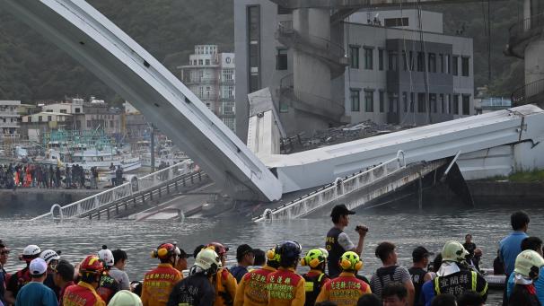 Un pont s’est effondré, ce mardi 1er octobre, dans le port de pêche de Nanfangao, au nord-est de Taïwan. Des images de vidéosurveillance ont filmé cet édifice de 140 mètres de long en train de s’écrouler, notamment sur les bateaux amarrés au-dessous, entraînant la chute d’un camion-citerne.